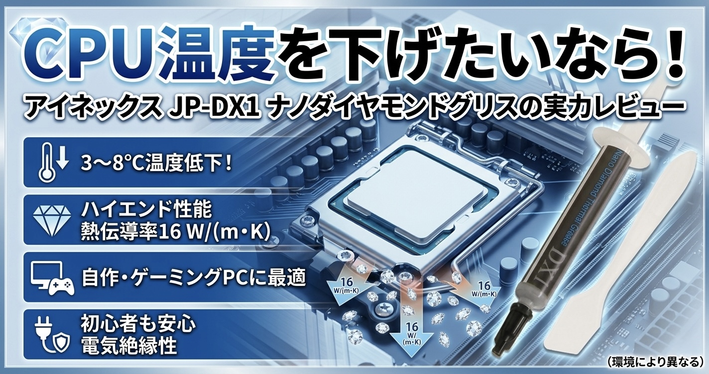 「最近PCがなんか熱い気がする」「グリスを塗り替えたらCPU温度って本当に下がるの?」そんな疑問を持ったことはありませんか?実はCPUグリスは、冷却パフォーマンスを大きく左右する重要なパーツの一つ。なかでも今回ご紹介するアイネックス(AINEX)のナノダイヤモンドグリス「JP-DX1」は、熱伝導率約16.0 W/(m・K)というハイエンド級のスペックを持ちながら、リーズナブルな価格で手に入れられる注目製品です。本記事では、JP-DX1の特徴・スペック・使い方から、他の製品との比較まで徹底的に解説します。「グリス選びで迷っている」「CPU温度をもっと下げたい」という方は、ぜひ最後まで読んでみてください!
